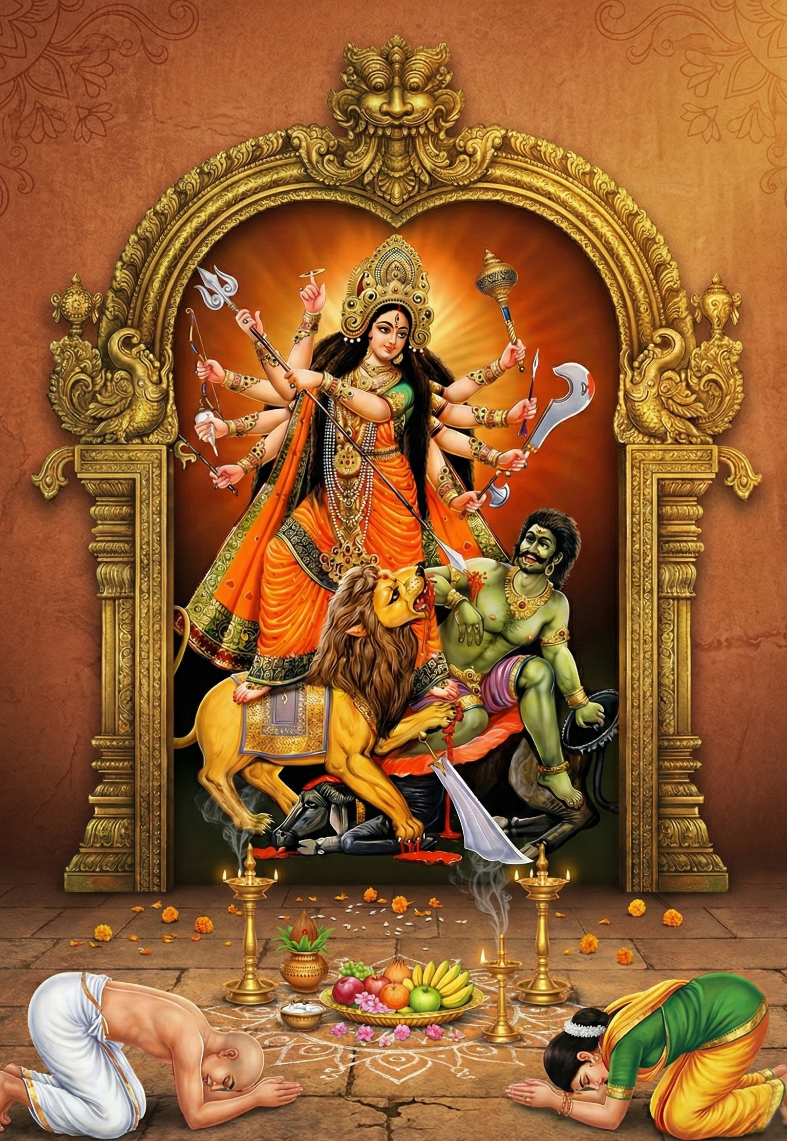 “She Leapt Upon the great asura, Pinned his neck down With Her Foot, And Pierced him through With Her Spear.”