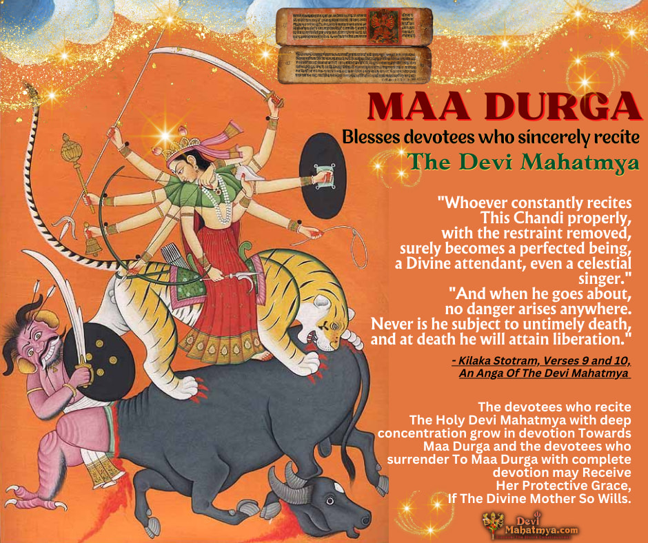 The devotees who recite The Holy Devi Mahatmya with deep concentration grow in devotion Towards Maa Durga and the devotees who surrender To Maa Durga with complete devotion may Receive Her Protective Grace,